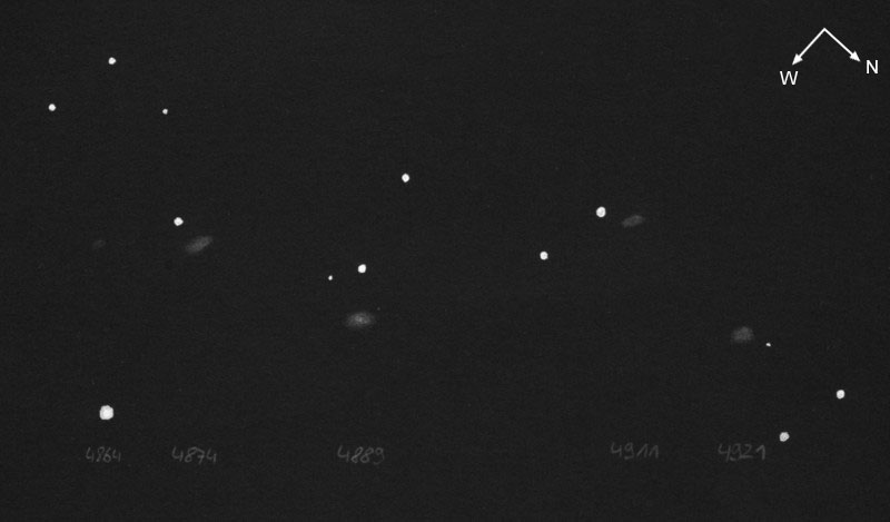 This was my first drawing. When I had the 10” only a short time I didn't know my new limits. I wanted to get to know the them with this cluster. I hopped to this cluster without any exact chart and found these five galaxies. I saw some others but I couldn't find them again when I made the sketch. With good conditions and a good finding chart some 70 more galaxies are possible!