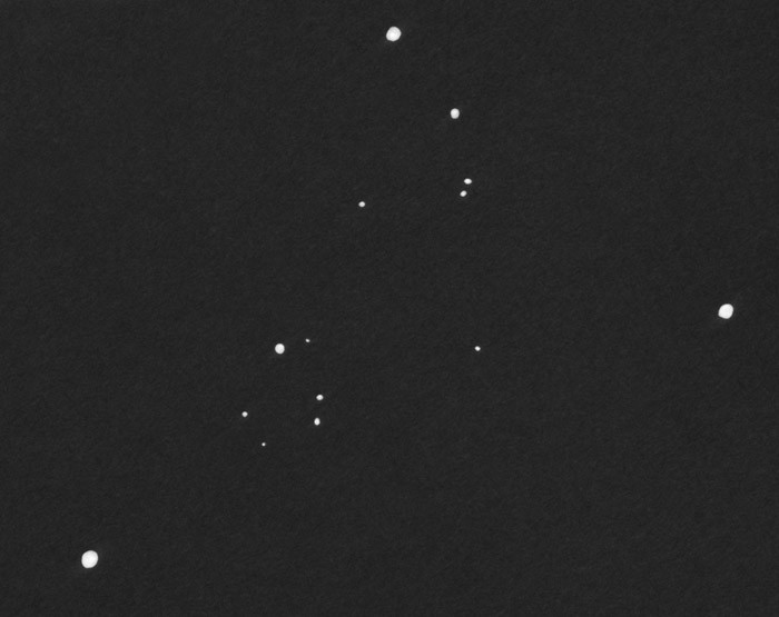 Basel 15: Zunächst ist nichts Sternhaufen-artiges zu erkennen. Bei genaueren Hinsehen erscheint eine Gruppe von 6 12-14mag Sternen. Nicht wirklich als Sternhaufen zu erkennen.