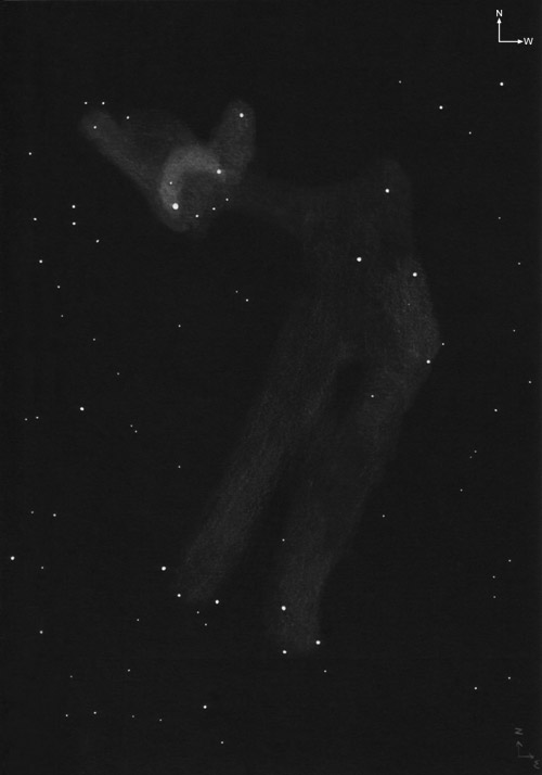 IC 405: Extrem großer Nebel. Um AE Aur relativ hell, die Fahne richtung W ist deutlich dunkler und sehr kontrastarm. Sie besteht aus zwei parallelen Streifen. Zwischen der Fahne und AE Aur ist nur eine schmaler Nebelbalken als Verbindung. Der Teil um AE Aur ist komplexer strukturiert mit einigen Bögen.