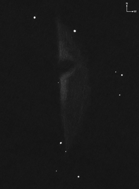 B 33: The Horsehead Nebula has very low contrasts. It is visible as a small indentation in IC 434. It seems to by bulgy to the north.