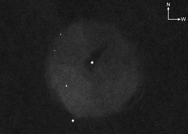 IC 5146: H-β filter: faint, round nebula. Appears brighter to the south, fainter in the northern quater. Diffuse rim, some stars embedded which appear very faint with filter. Around the star in the center a dark structure extending further north is visible