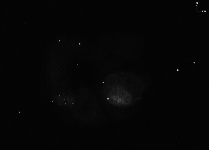 Messier 8: Mit UHC Filter. Westlich 6 Sgr ist der Nebel ziemlich hell und der zentrale Teil erscheint etwas elongiert O-W. Darum ist eine größere Nebelblase, gleichmäßig nach Außen auslaufend. Der Sternhaufen im Osten ist von einem schwachen Nebel umgeben. Zwischen Sternhaufen und dem hellsten Teil ist es dunkler aber nicht nebellos. Nördlich der Teilung befindet sich eine Dunkelwolke. Weiter nördlich ist diese von einem sehr schwachen Bogen umschlossen.