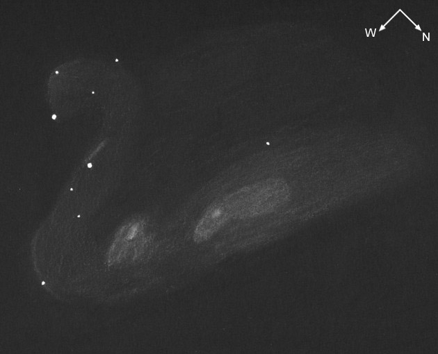 Für mich ist der Schwanennebel M17 gleichauf mit dem Orionnebel als der beeindruckenste Gasnebel! Leider steht er für Mitteleuropäer recht tief. Die Zeichnung entstand zudem unter schlechten Bedigungen und ohne Filter. Sie muß bei besseren Bedingungen unbedingt noch einmal wiederholt werden, dann wird es aber wahrscheinlich schon sehr schwierig, den Detailreichtum noch zu Papier zu bringen!