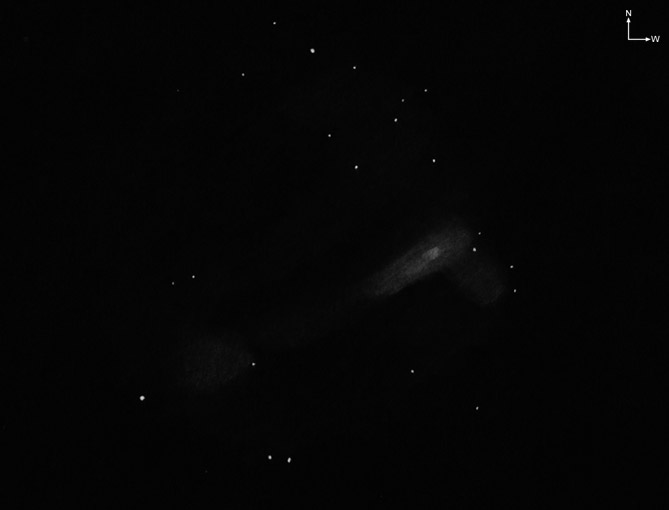 Messier 17: Mit UHC Filter. Der Schwan ist ein heller Nebel und in der Mitte des Körpers heller. Der Halsbereich ist ziemlich schwach und schwierig abzugrenzen. Nordöstlich des hellsten Teil erstreckt sich der Nebel noch etwa 35' weit. Dort ist er aber ziemlich schwach und mit wenig Kontrast. In Verlängerung des Schwanenkörpers befindet sich eine hellere Stelle in den Ausläufern.