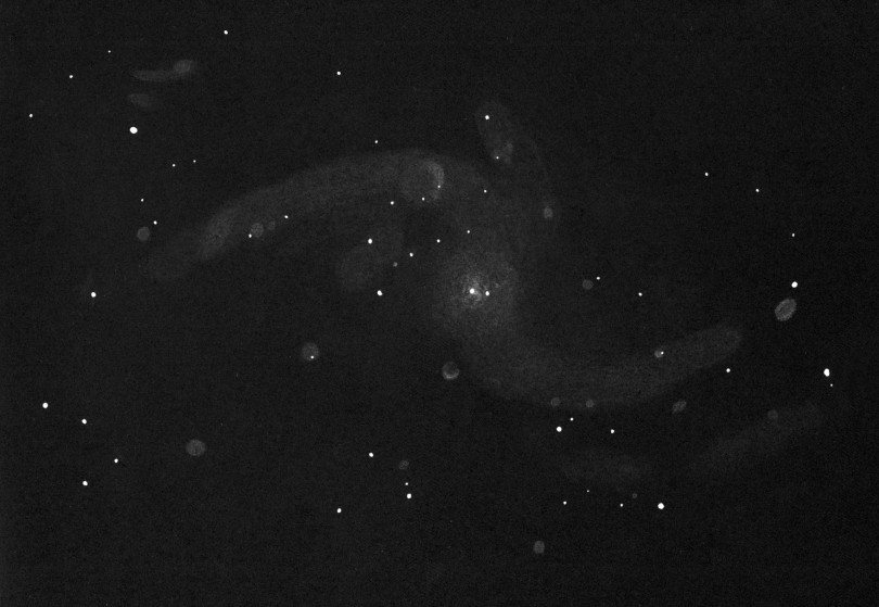 Sehr schwacher Knoten, westlich eines schwachen Sterns, bei ind. Sehen deutlich. Steht an der Südkante des südlichen Spiralarms.