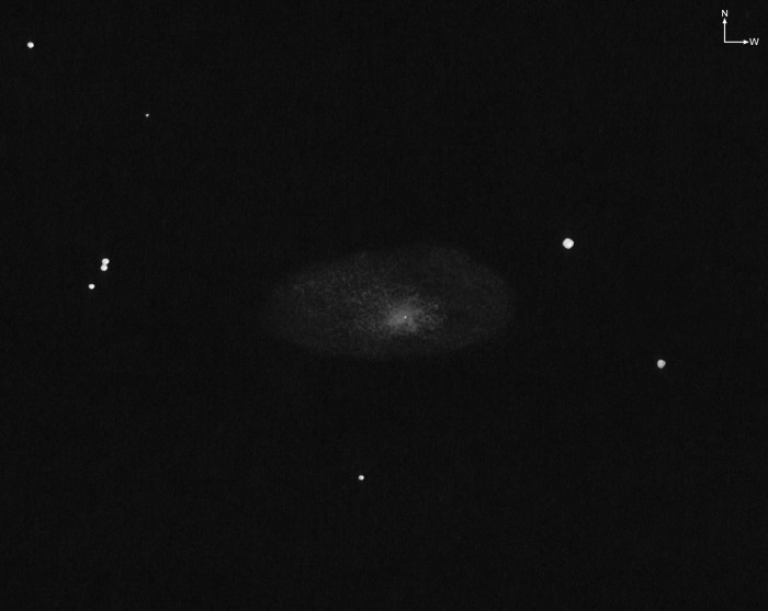 M 63: Sehr helle Galaxie, ca. 3:1 elongiert O-W. Im Süden ist sie etwas abgeflachter und der Ostteil ist heller. Sonst sind keine Strukturen zu erkennen.