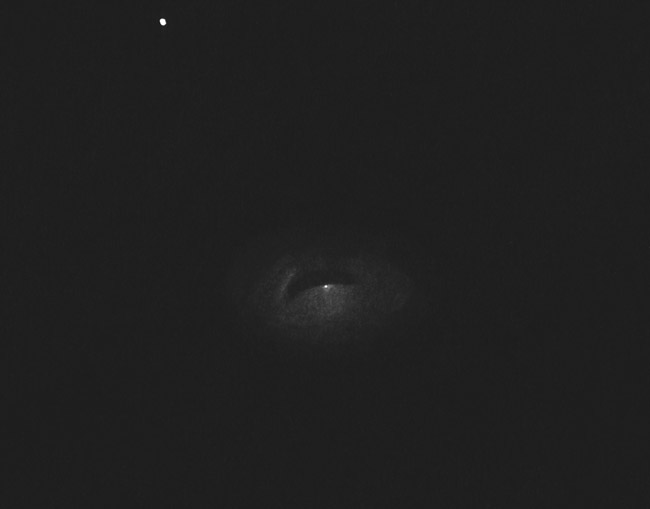 M 64: Very bright galaxy. The Dark Eye is very prominent. The galaxy has a very bright, oblong-extended center with a core. The Dark Eye lies direct north of it. The galaxy is pretty large and fades to the sky. Northeasr of the Eye is a brighter spot, the galaxy is fainter in the north.