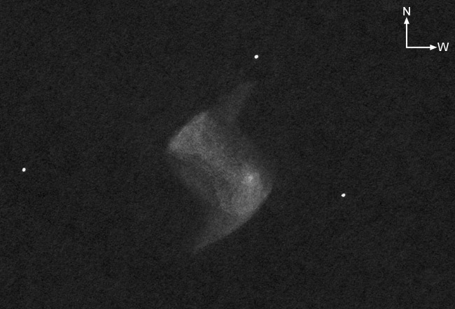 Messier 76: UHC Filter. Recht gute Filterwirkung. Es ist zuerst der zentrale Balken zu sehen mit großen Knoten im Norden und Süden. Der südliche ist etwas heller und hat im W eine Helligkeitsspitze. Der nördliche Knoten erscheint dreieckig. Beide Knoten sind mit einem schmalen Streifen verbunden. Im SO und NW setzen schwache Fortsätze an. Abseits der Knochenförmigen Form des zentralen Balkens sind noch sehr schwache Nebelfetzen zu sehen, so dass eine eckige Form entsteht. Mit [OIII] Filter ist kaum noch Kontrast da, mit Hβ-Filter verschwindet der Nebel fast!