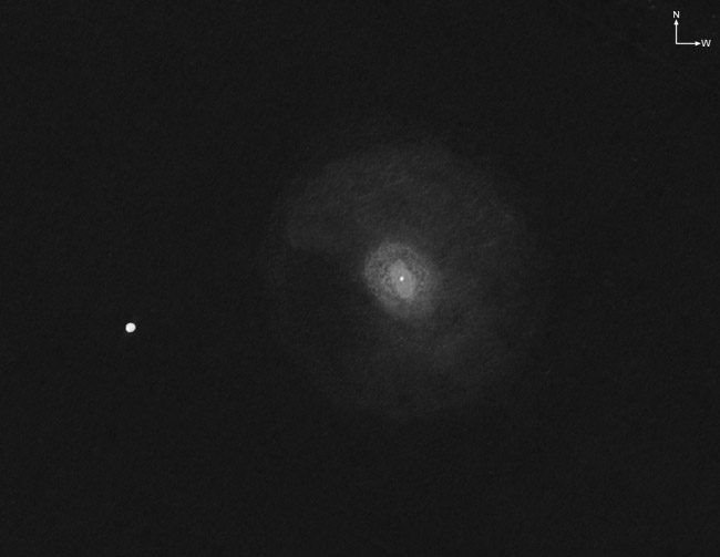 M 77: Bei 274x erscheint das Zentralgebiet NO-SW elongiert, während die gesamte Galaxie fast rund erscheint. Im SO erscheint die Galaxie großflächig dunkler. Ich kann die Galaxie etwa bis zur Hälfte zu dem hellen Stern im SW verfolgen (91x). Die Galaxie hat einen sehr hellen Kern mit einem sehr hellen Zentralgebiet und dunklen Außenbereichen.