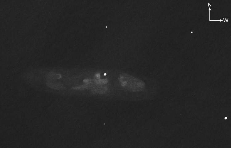 Messier 108: Very bright galaxy with evident structure. A brighter star is close to the center, within the galaxy. The galaxy shows many knots but no obvious dark structures. The elongation is about 6:1 E-W. Comparable to M 82