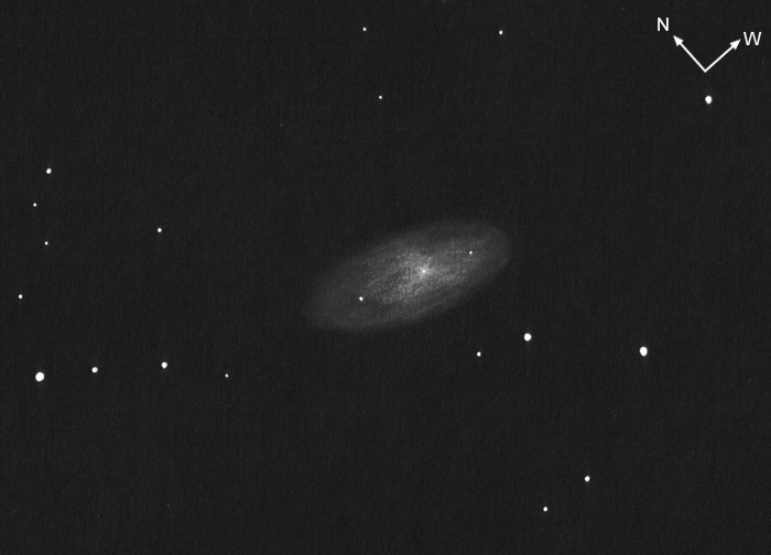 NGC 1023: Very bright galaxy, highly elongated about 4:1, much brighter towards the middle with a stellar core, appearing longer towards east, one star superimposed in west and east