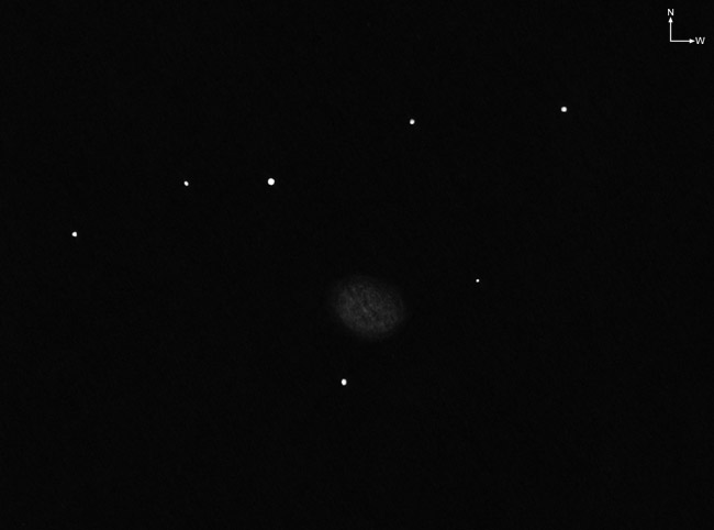 NGC 949: Etwas kleiner aber heller als NGC 1058. Relativ einfach sichtbar, leicht elongiert, kaum heller zur Mitte, kein Kern.