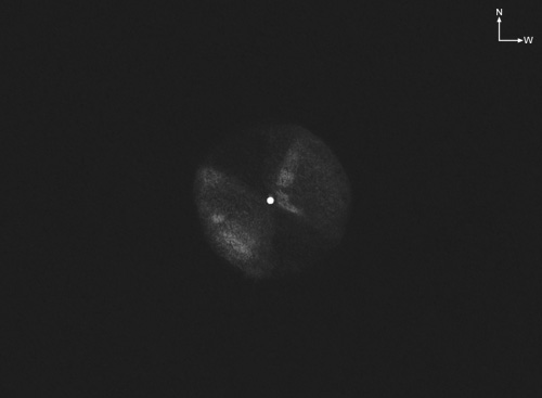 NGC 1514: Ohne Filter ist der PN relativ schwach aber direkt noch gut zu sehen. Mit [OIII] Filter dann deutlich heller. Ziemlich groß für einen PN. Obwohl insgesamt rund zeigt er eine deutliche bipolare Gestalt mit helleren Vierteln im Osten und Westen. Der östliche ist heller, hat im Süden eine Helligkeitsspitze und weiter nördlich abgesetzt einen weiteren Knoten. Der Westteil ist an der Nordseite heller sowie in der Nähe des sehr hellen Zentralsterns. Die anderen beiden Viertel sind ziemlich schwach und diffus.