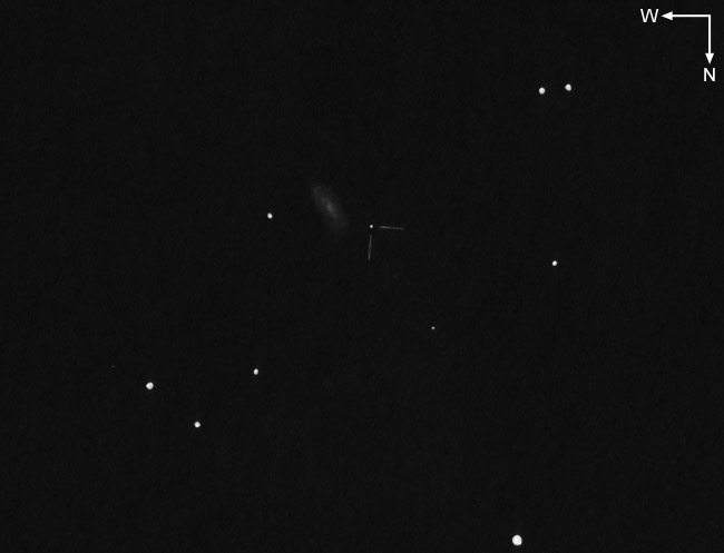 The supernova SN2005am is visible with averted vision. The foreground star nearby is not visible.