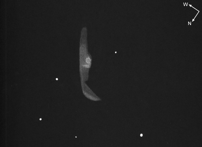 NGC 4656: Bright and considerably elongated galaxy with a fairly low surface brightness. In the middle is a distinct central condensation somewhat shifted W. The brightening is curved towards E. Connected to NGC 4657 in N.