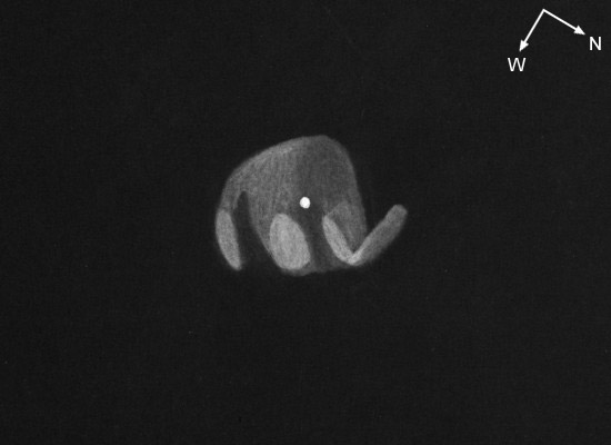 NGC 6543: Katzenaugennebel. Bei kleiner Vergrößerung zunächst oval, bei 300x und längerer Beobachtung bilden sich dann Strukturen heraus: der Zentralteil ist viergeteilt, zwischen dem hellsten Teil im NW und dem im NO verläuft eine Dunkelstruktur. Der NO-Teil ist im W noch sehr hell und wird nach O schwächer. Am mittelhellen SW-Teil setzt ein Bogen ähnlich eines Spiralarms an, der zum Ende noch heller wird, zwischen ihm und dem Nebel kann ich einen ganz schwachen Nebel erkennen. Ein anderer Bogen setzt am äußersten NO Teil an und verläuft kürzer und gerade. Er ist auch nicht so hell. Den ZS kann ich bei Verwendung eines Gelbfilters erkennen.