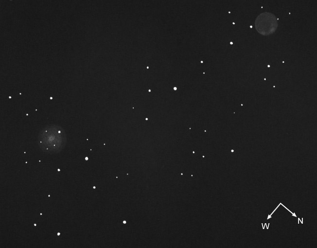 A pretty pair in the Scutum Star Cloud. NGC 6712 (left) is a pretty faint globular cluster. In it stars are barely resolvable. IC 1295 (right) in contrast is a planetary nebula. It is one of the best examples that one should never rely on photographic magnitudes of planetary nebulae. In the literature values of 15m0p are found, but visually 12m are realistic! When looking that star field with low powers you will see NGC 6712 at first. When using a filter two equal bright and equal large smudges appear — NGC 6712 und IC 1295.