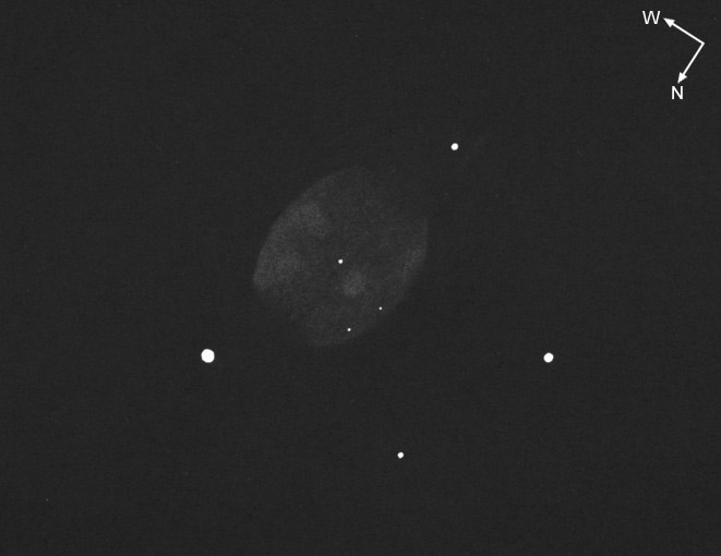 NGC 6905: very bright, large, situated between two medium bright stars in a trapeze. The central star is visible, in E two stars are embedded. The rim is brighter in SE, a brighter knot lies in NW. Between the central star and the embedded stars is a further knot. The nebula fades towards N and S while the other sides are relatively sharp defined.