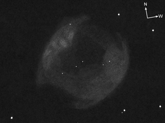 NGC 7293: sehr hell, im 7x50 Sucher einfach, deutlicher Ring, Ostteil heller mit Knoten, Ausfransungen an den Enden der hellen Seiten, mehrere Sterne eingebettet, ZS nur ohne Filter sichtbar