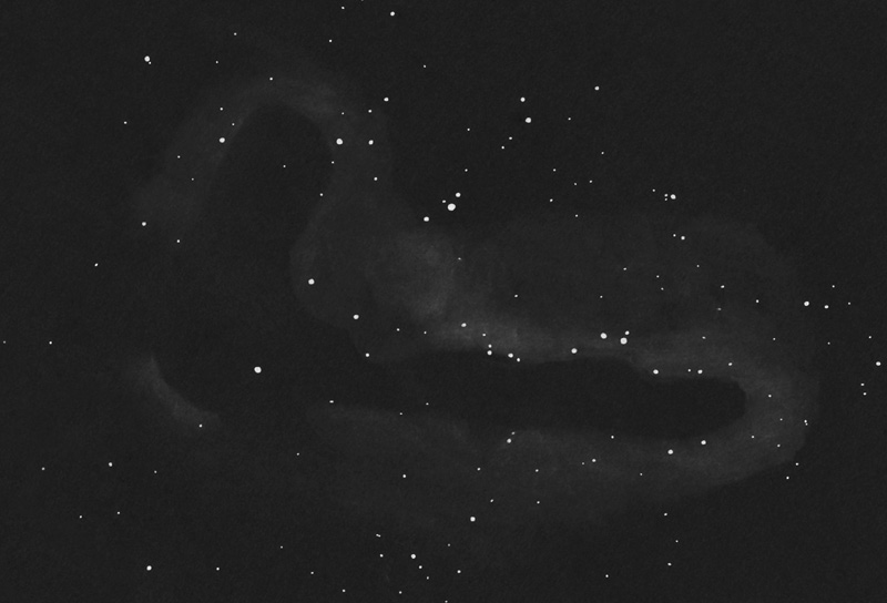 Pfeifennebel: Sehr großer Dunkelnebel, im 7x50 Fernglas am schönsten, aber auch mit dem bloßen Auge zu erkennen. Der Pfeifenhals ist am deutlichsten zu erkennen, vor allem am Ende, südlich von 36 Oph. Die Beule nach Norden ist sehr schwierig.