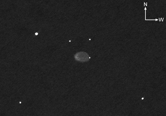 klein und oval O-W, im Osten etwas heller (ein Stern?). Liegt in einem Sterndreieck, ein Stern wird an