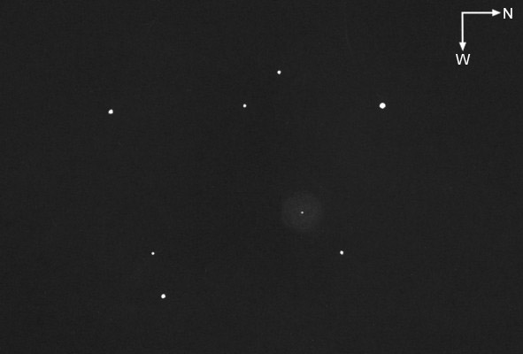 Abell 82: Only visible with [OIII] filter attached. Very faint round nebula about 1' in size. Situated in a trapeze of faint stars, pretty close to the northwestern star. The central star is visible only without filter, but the nebula disappears. Not difficult.