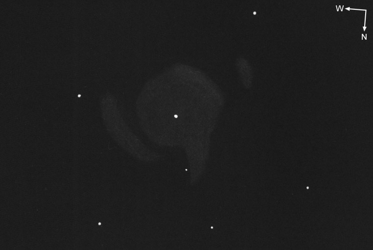 several nebulous arcs around. The southern rim is a little brighter. In the west is a separated arc, in the