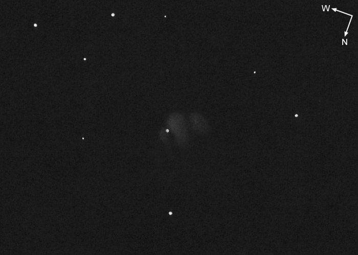 Sh 2-112: only visible with [OIII] filter, faint nebula east and southeast of a brighter star. The middle is crossed by a SW-NE running dark streak. Direct north of the star is a brighter area.