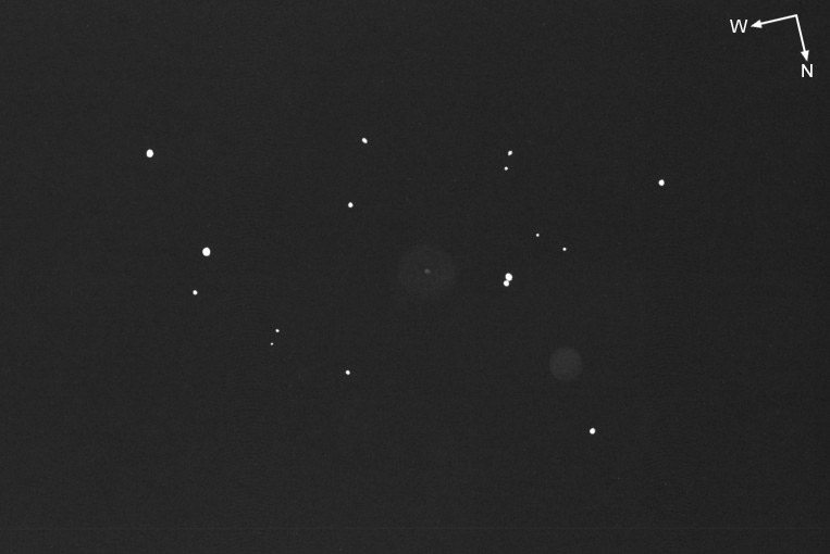 UGC 2259: Sehr schwache Galaxie, recht groß und sehr flächenschwach. Wird zur Mitte nicht heller hat aber einen Kern. Sie erscheint rund. Mit PGC 10589 im Gesichtsfeld.