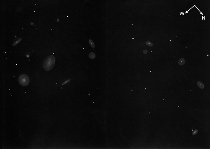 Das Zentrum des Virgohaufens ist auch mit kleinen Teleskopen ein beeindruckendes Galaxienfeld. Es ist dort nicht selten, dass bei kleiner Vergrößerung 5 oder mehr Galaxien im Gesichtsfeld sind. Die Zeichnung ist ein Mosaik aus zwei Zeichnungen. Die erste war auf das Zentrum des Virgohaufens um M 84 und M 86 gerichtet. Die zweite fertigte ich gut ein Jahr später an und sie sollte die sich am Zentrum anschließende Markarian's Chain dokumentieren. Von links nach rechts sind zu sehen: NGC 4388, M 84, NGC 4387, NGC 4413, M 86, NGC 4425, NGC 4402, NGC 4438 (oben), NGC 4435 (unten), NGC 4458, NGC 4461, NGC 4473, NGC 4459 und NGC 4477